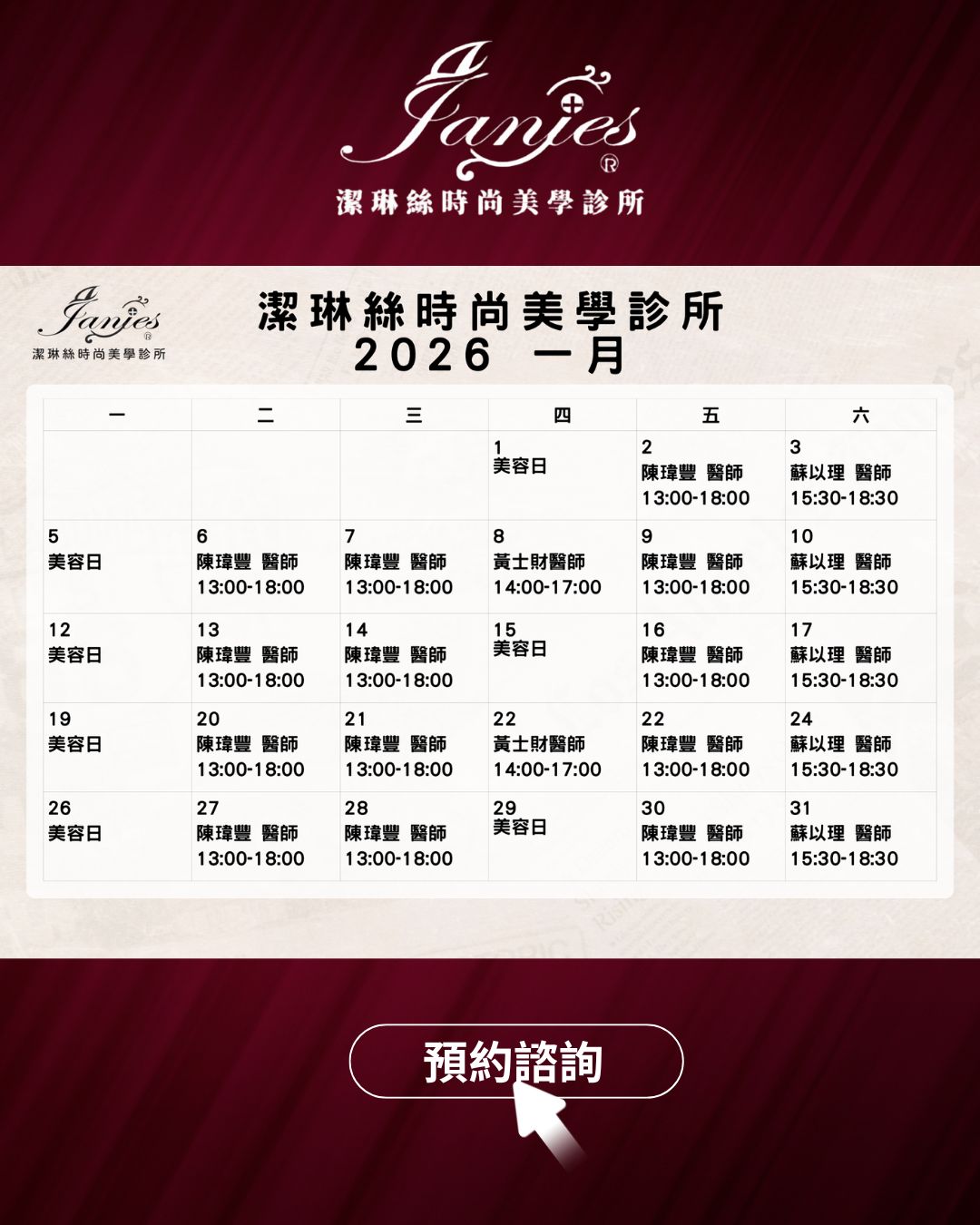 潔琳絲時尚美學診所 1月門診時間表 歡迎提前預約 2026讓自己看起來更有精神