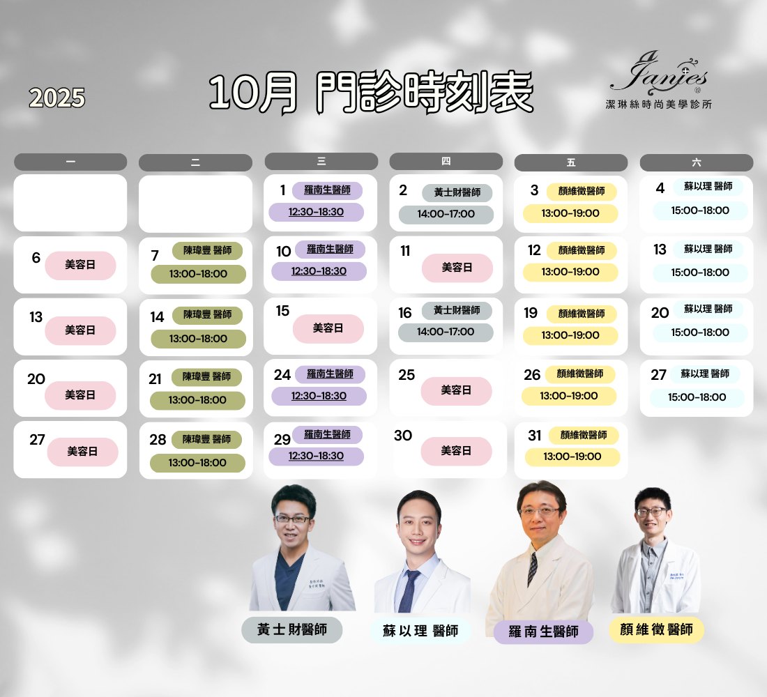 潔琳絲 10月醫師門診表 快來預約專屬的美麗蛻變吧