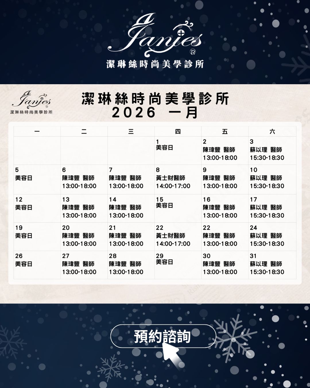 潔琳絲時尚美學診所 1月1日元旦正常營業 2026 讓自己看起來更有精神